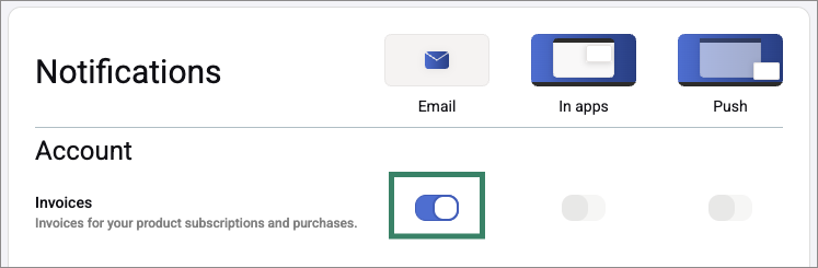 - In‑app notifications – Greyed out. This option isn't used for invoice notifications.
